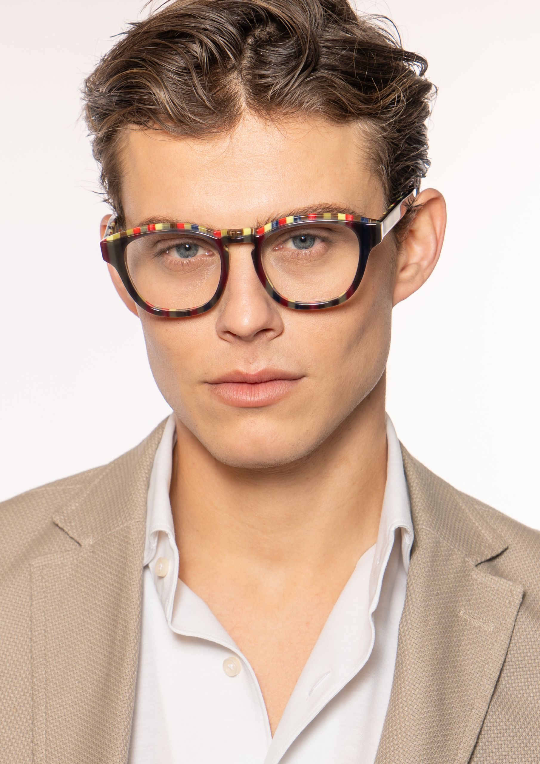 Un modello unisex dal design tondo, il cui frontale presenta uno scavo caratterizzato da righe vivaci dai colori con effetto “pappagallo”, ripresi anche all’interno delle aste, per un dettaglio distintivo e audace.