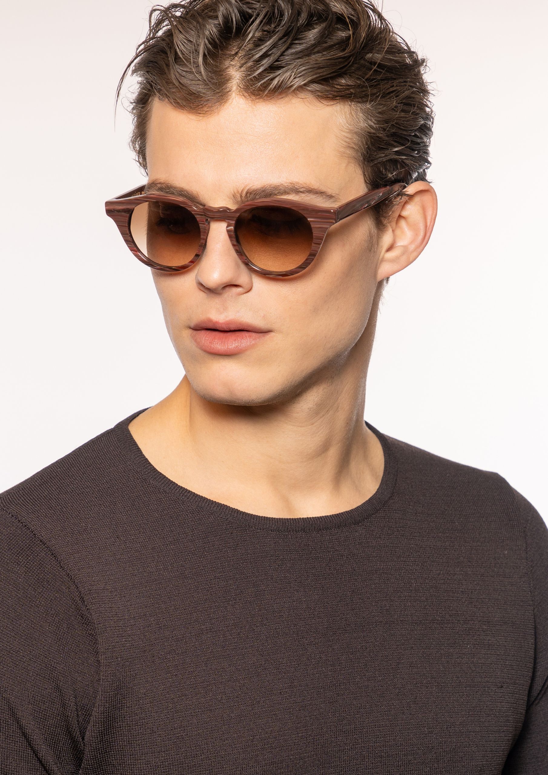 Linee morbide e proporzioni equilibrate definiscono Sfera, un occhiale unisex dalla forma tonda con ponte a chiave, che rievoca un’eleganza discreta dal sapore vintage. La montatura, leggermente sollevata nella parte superiore dello sguardo, dona apertura e carattere.